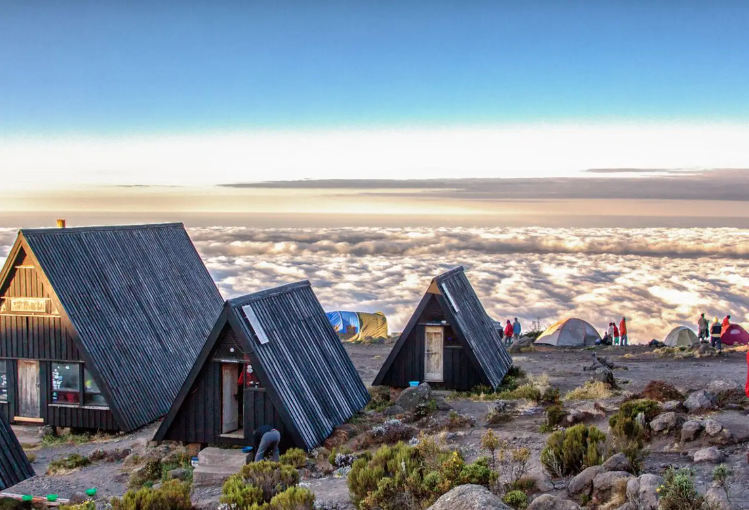 Situated in the barren Alpine desert is Kibo hut, a stone build block house which has bunk beds for 60 climbers, but no streams with water nearby. It is however possible to buy mineral water and soft drinks at the camp office. There are platform toilets behind the hut.
